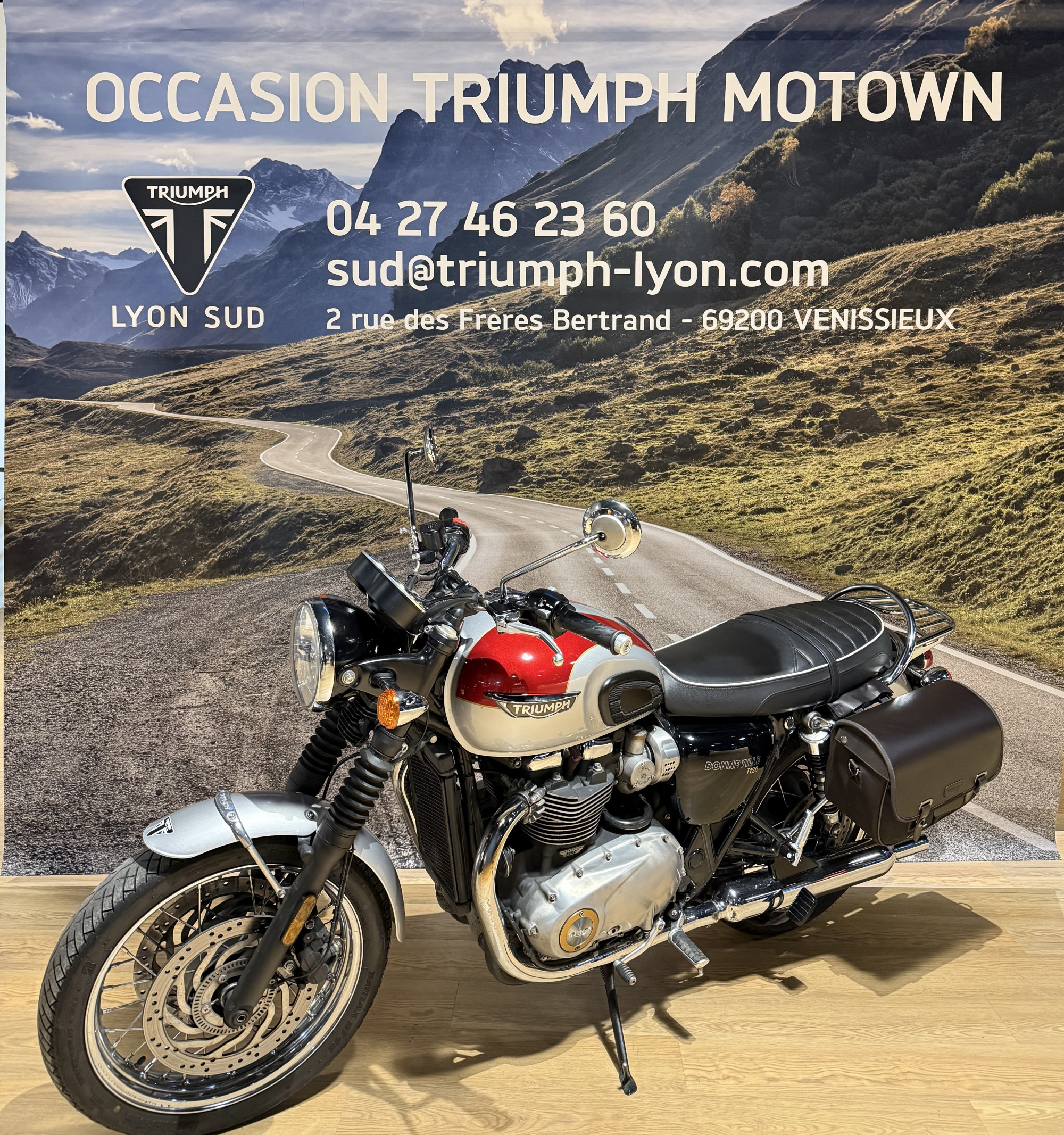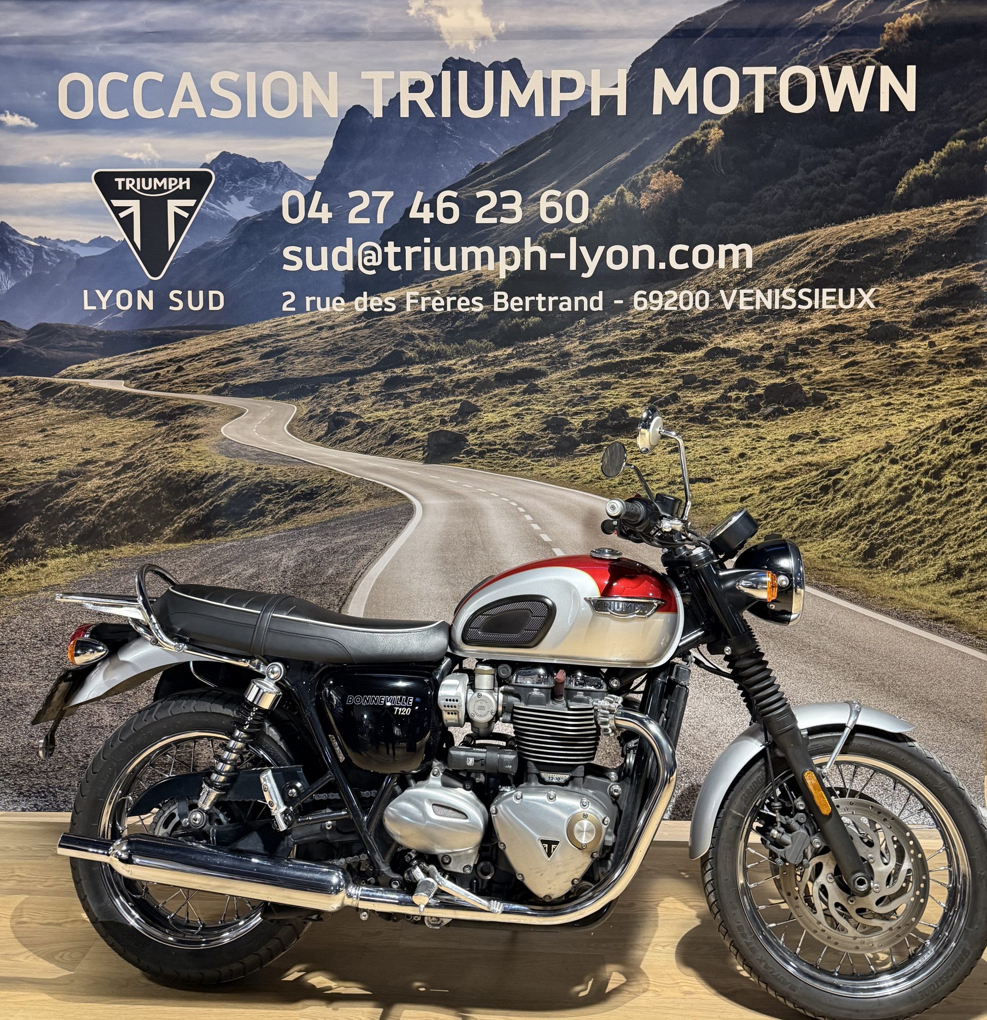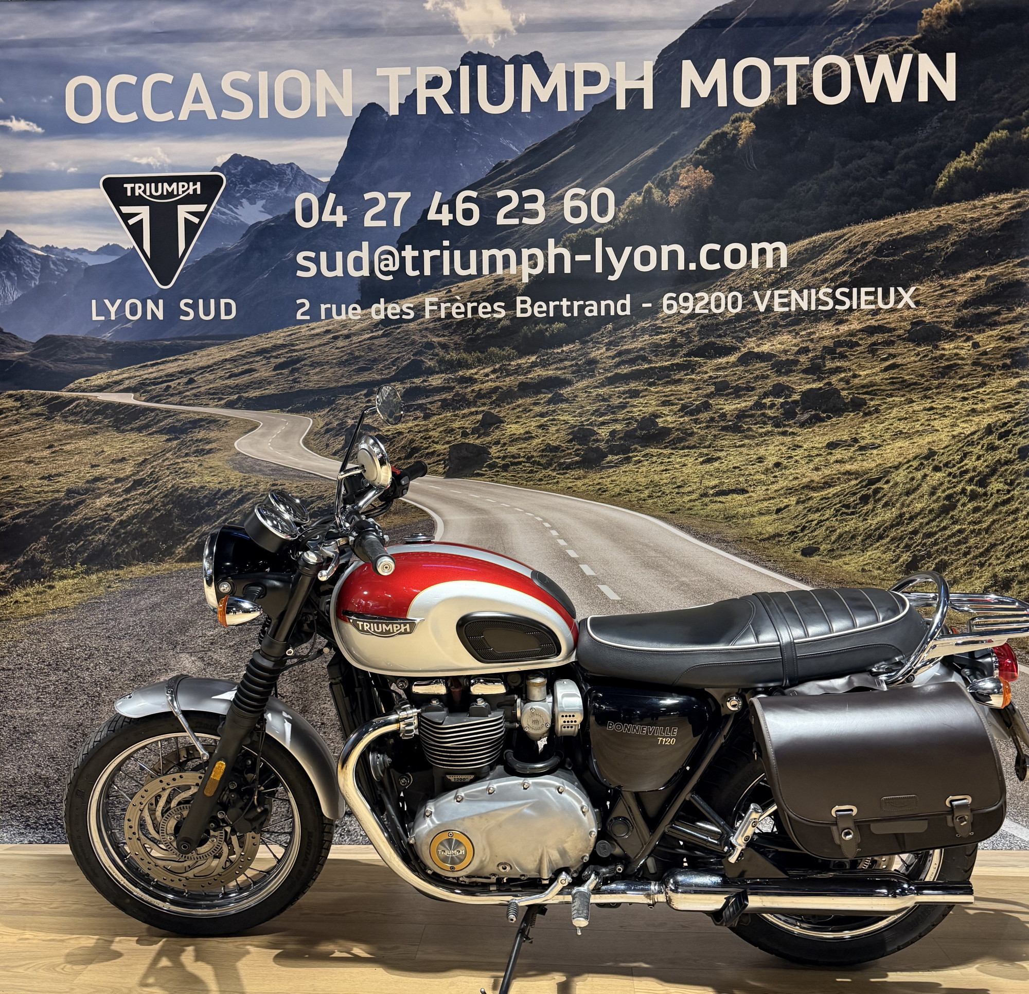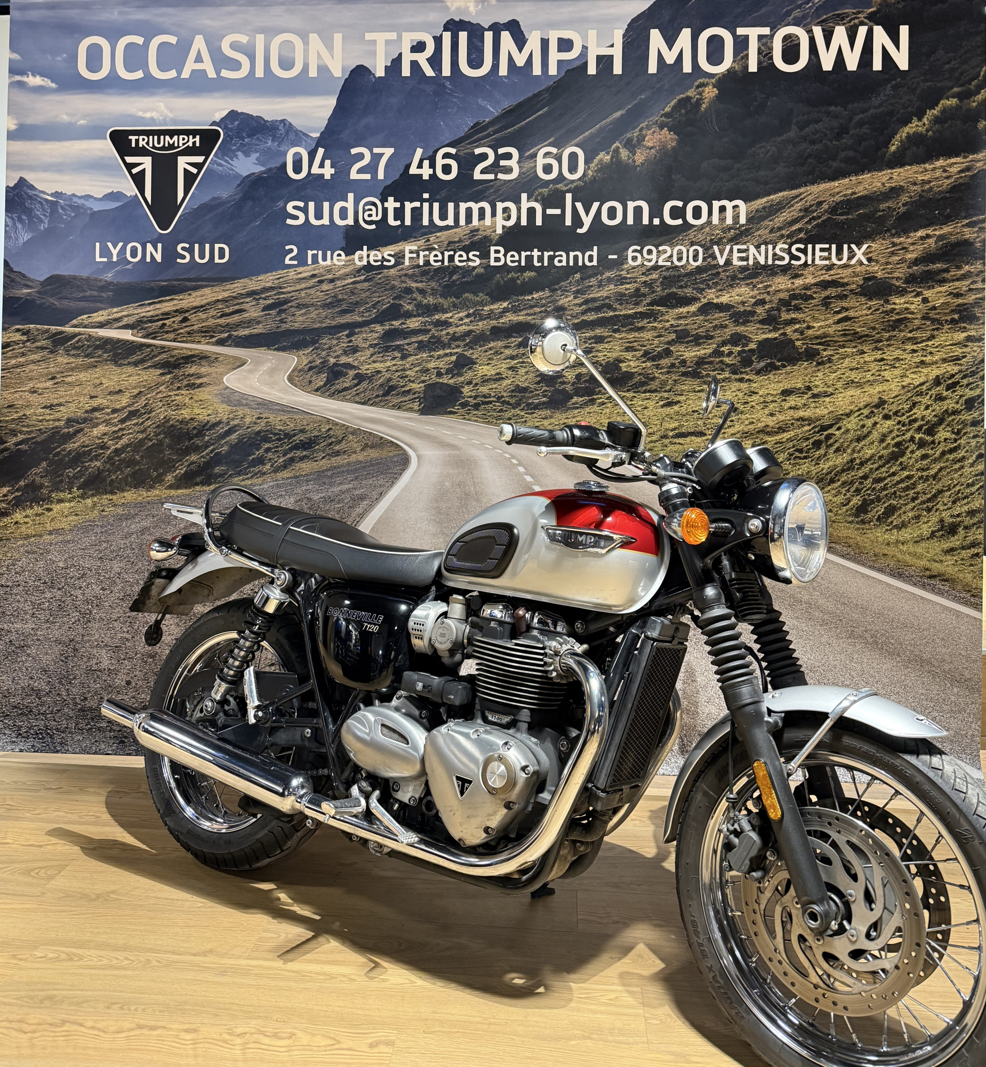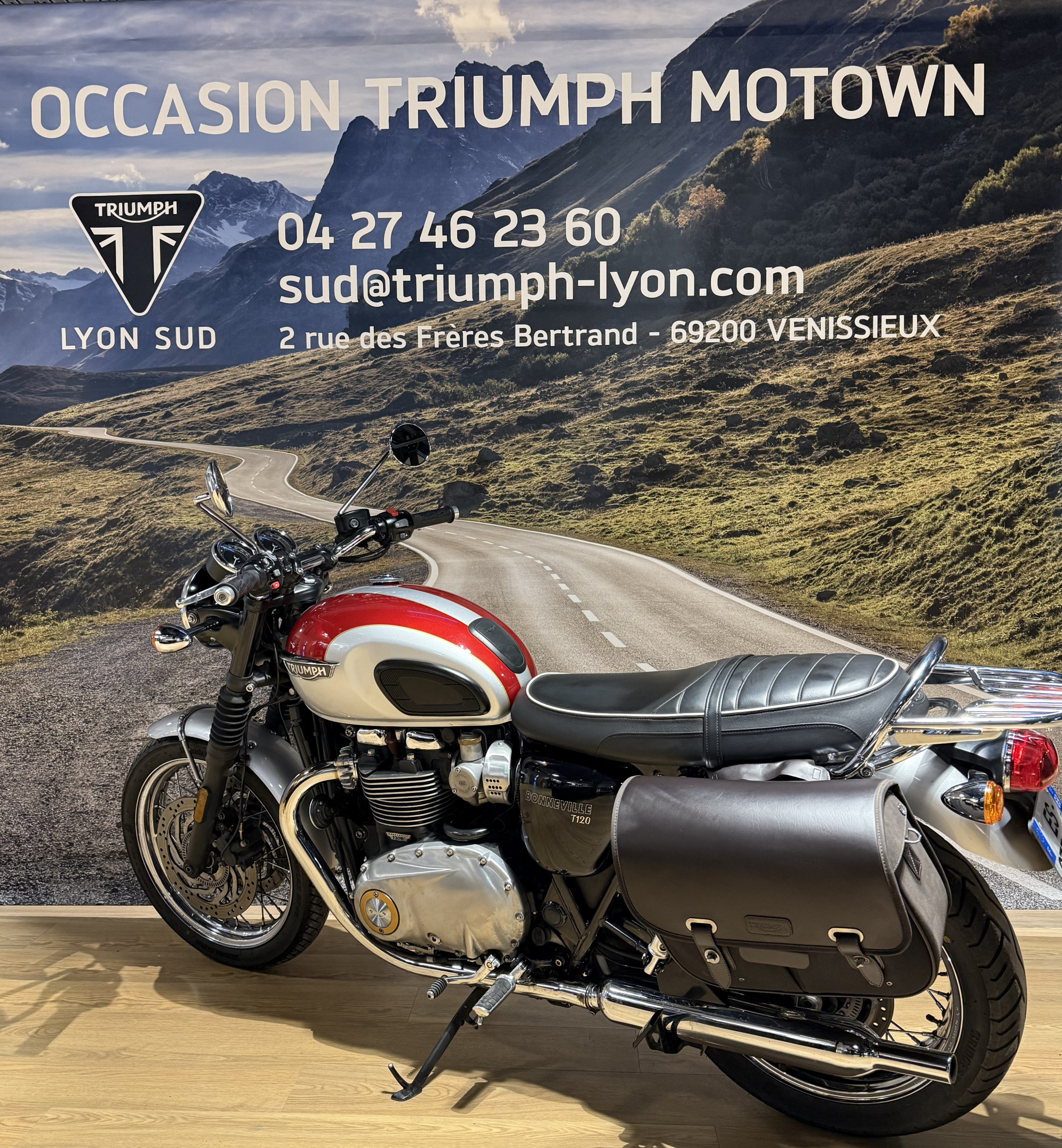 La concession TRIUMPH Lyon vous propose cette TRIUMPH Bonneville T120 couleur Cranberry Red / Aluminium, en très bon état, totalisant 30 474 km.